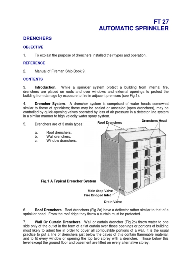 1 to provide full control of the fixed water-based fire-fighting systems from a. Sprinkler Pump Both Fire Fighting Main Pump and Jockey pump jointly ensure sufficient supply of water pressure to the sprinkler system in case of the fire incident. Drenchers are a system of water heads that are used for the fire protection.